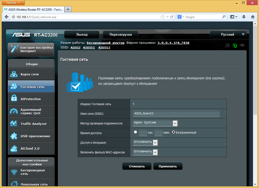 Как и у других современных роутеров Asus, в рассматриваемой модели пользователю доступно создание до трех гостевых беспроводных сетей с собственными именами и параметрами защиты для каждой из трех точек доступа.