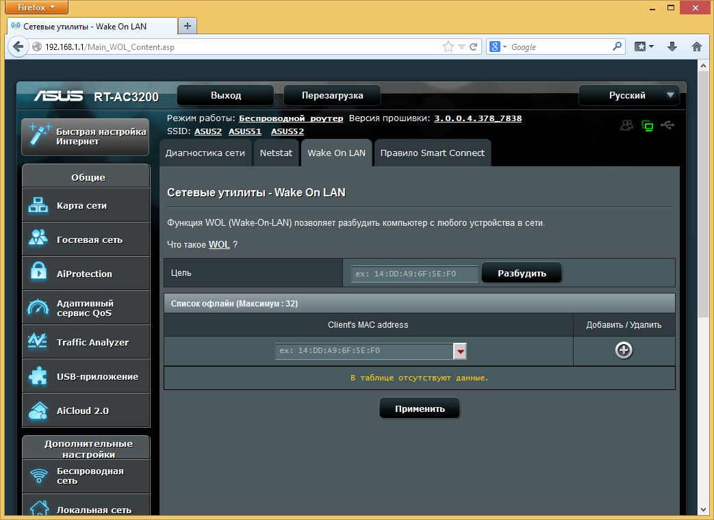 Прошивка рассматриваемого роутера очень похожа на ранее виденные версии AsusWRT в моделях этого производителя. Напомним, что присутствует и качественный русский перевод веб-интерфейса. Отличия заключаются в основном в специфических для данной аппаратной конфигурации функциях, а также нескольких дополнительных сервисов, реализовать которые позволила мощная платформа устройства.