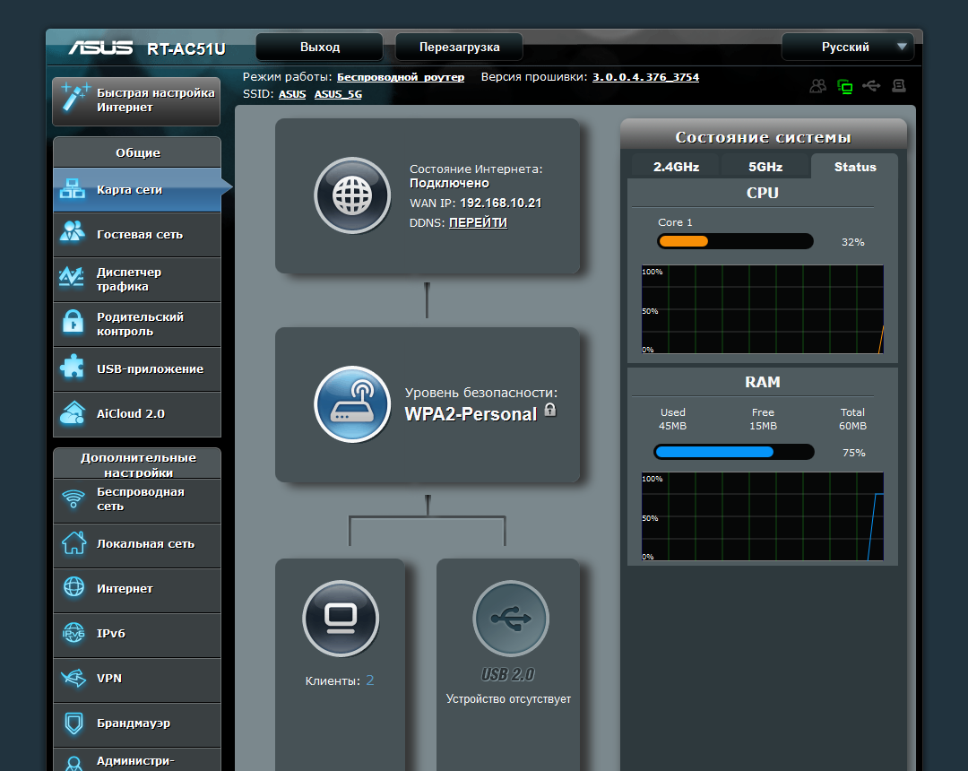 После входа пользователь видит удобную страницу «Карта сети», которая позволяет быстро оценить состояние устройства, определить число подключенных клиентов и внешних устройств, проверить загрузку процессора и оперативной памяти.