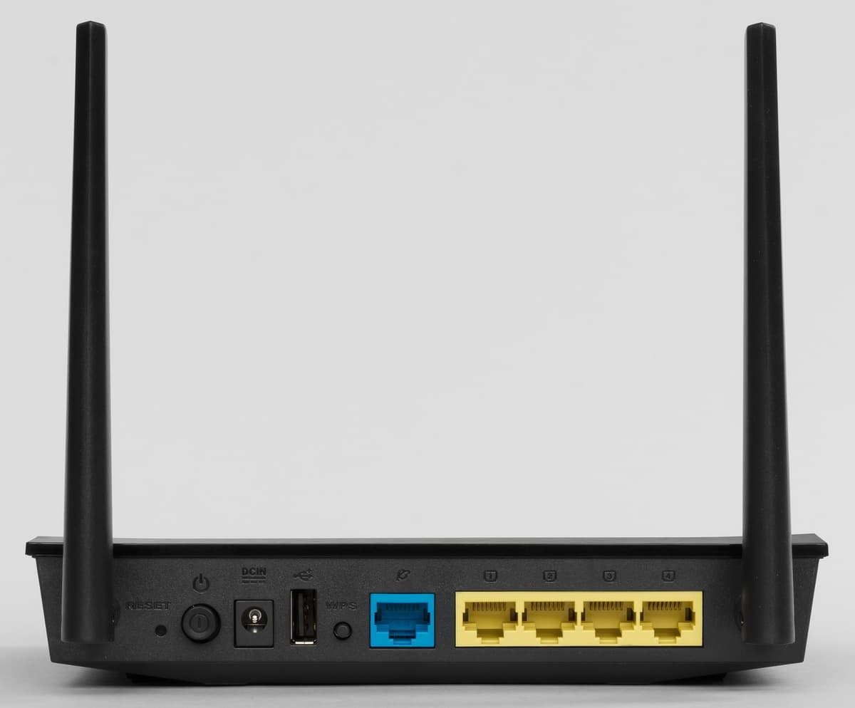 Сзади расположены две беспроводные антенны, четыре порта LAN, один порт WAN, кнопка WPS, порт USB 2.0, вход и выключатель питания, скрытая кнопка сброса. Расположение портов достаточно удобное, но для крупных USB-устройств возможно потребуется использовать удлинитель.