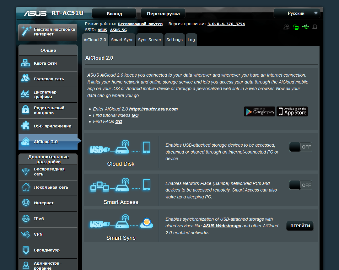 В роутерах Asus с портами USB также реализуется набор сервисов AiCloud 2.0. Они позволяют иметь доступ к данным на подключенных накопителях и серверах в локальной сети через интернет с компьютеров и мобильных устройств, а также синхронизировать информацию с облачным хранилищем Asus Webstorage. Заметим, что к их работе были определенные нарекания с точки зрения безопасности.