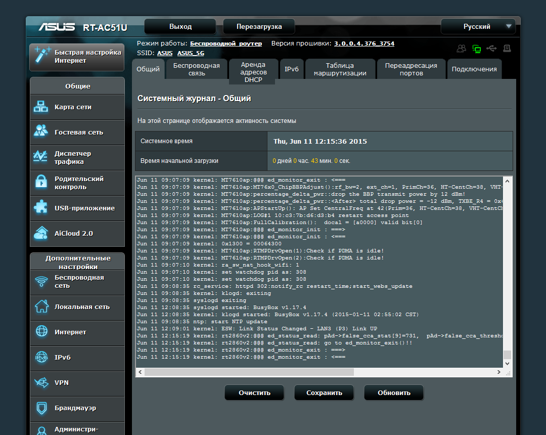 Традиционно присутствует журнал системных событий (он сохраняется только в самом устройстве), список беспроводных клиентов с указанием их режимов работы, список арендованных IP-адресов, таблица маршрутизации, список переадресованных через UPnP портов, список текущих сессий и статус IPv6.