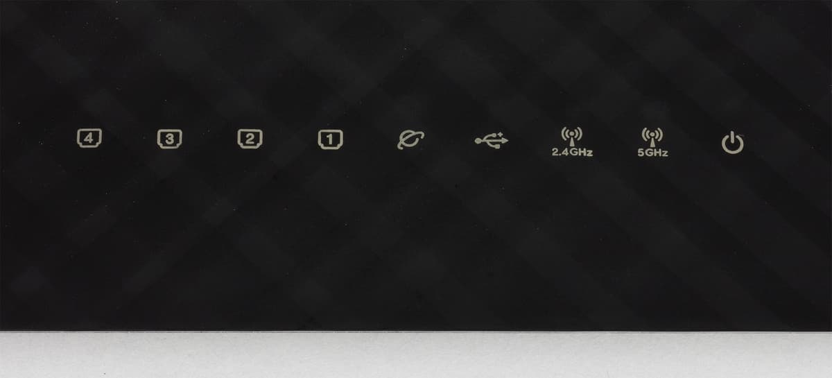 В верхней части мы видим нанесенные обычной краской логотип компании и название устройства, а в центре ближе к переднему краю находятся девять неярких голубых светодиодов. В данной модели среди них присутствуют индивидуальные индикаторы каждого проводного порта.