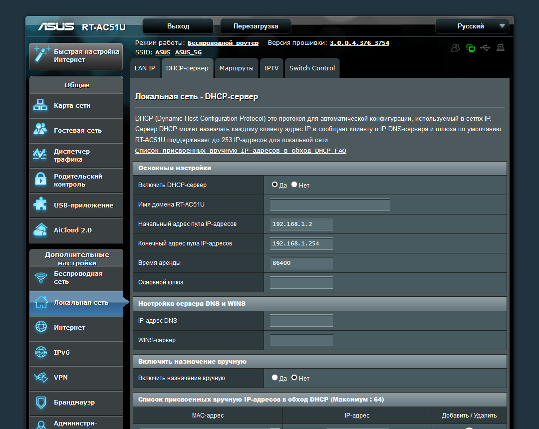 Настройки локального сегмента сети включают в себя выбор IP-адреса самого роутера и указание параметров работы встроенного сервера DHCP, включая резервирование адресов для клиентов.