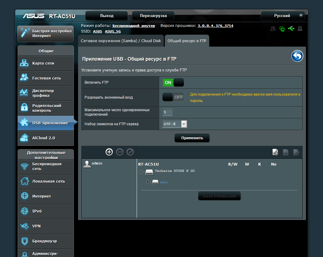 Для накопителей можно использовать такие популярные файловые системы как FAT32, NTFS и EXT3. Доступ к данным обеспечивается по протоколам SMB и FTP. Во втором случае можно работать с сервером и из интернета. При включенном режиме контроля прав пользователей, каждая папка на подключенных томах представляет собой независимый отдельный общий ресурс, права на который выдаются запрограммированным в роутере аккаунтам.