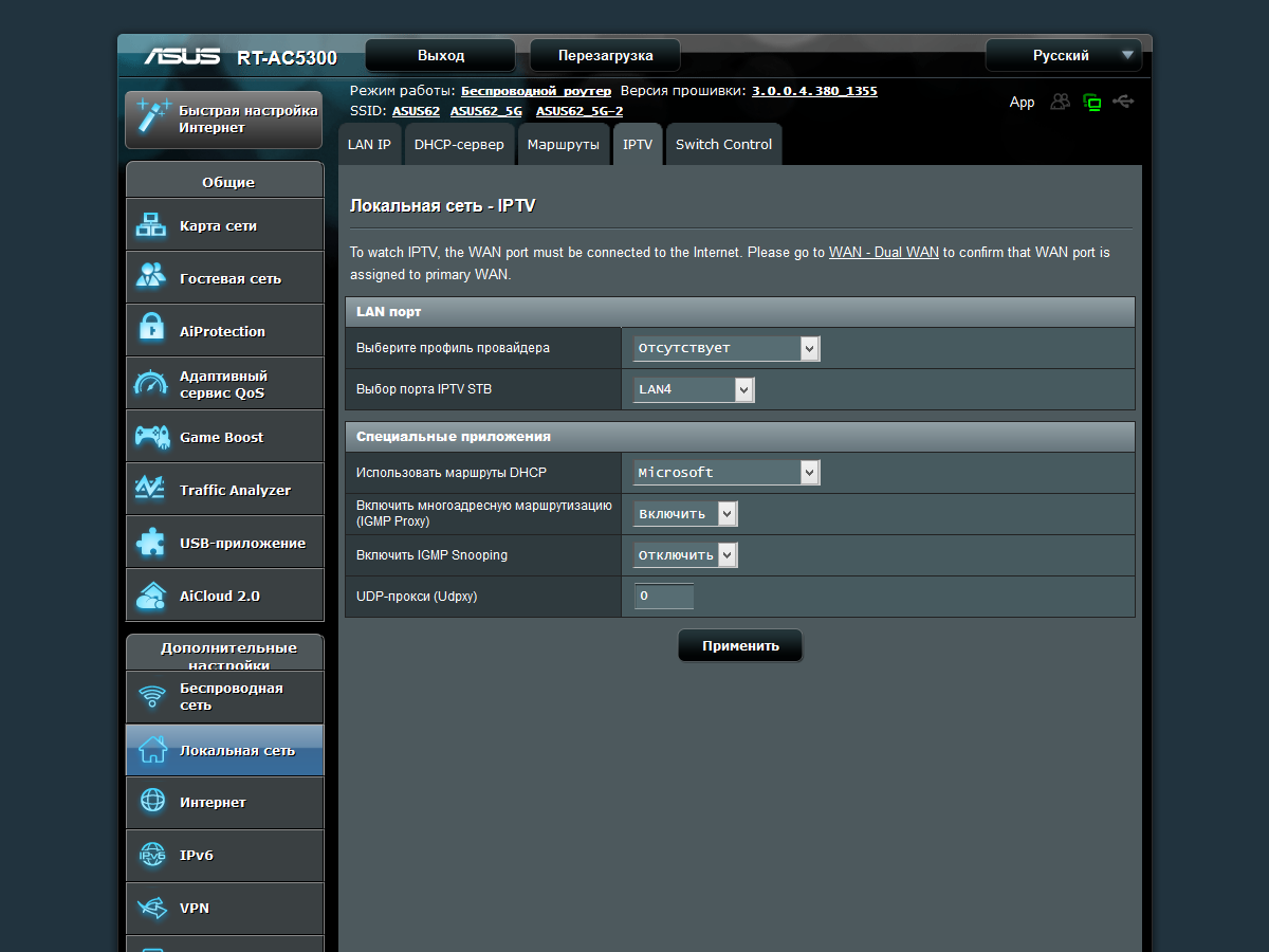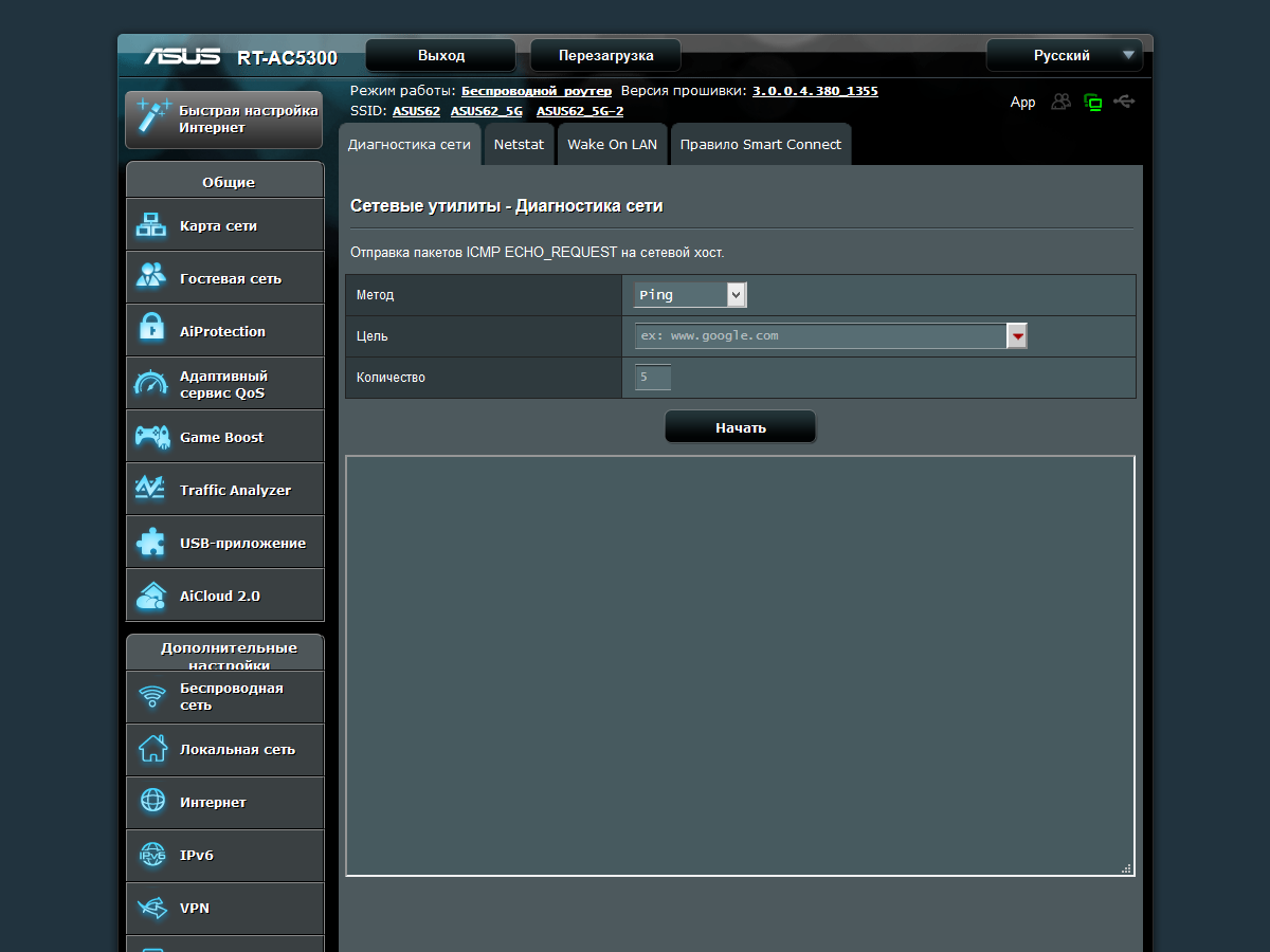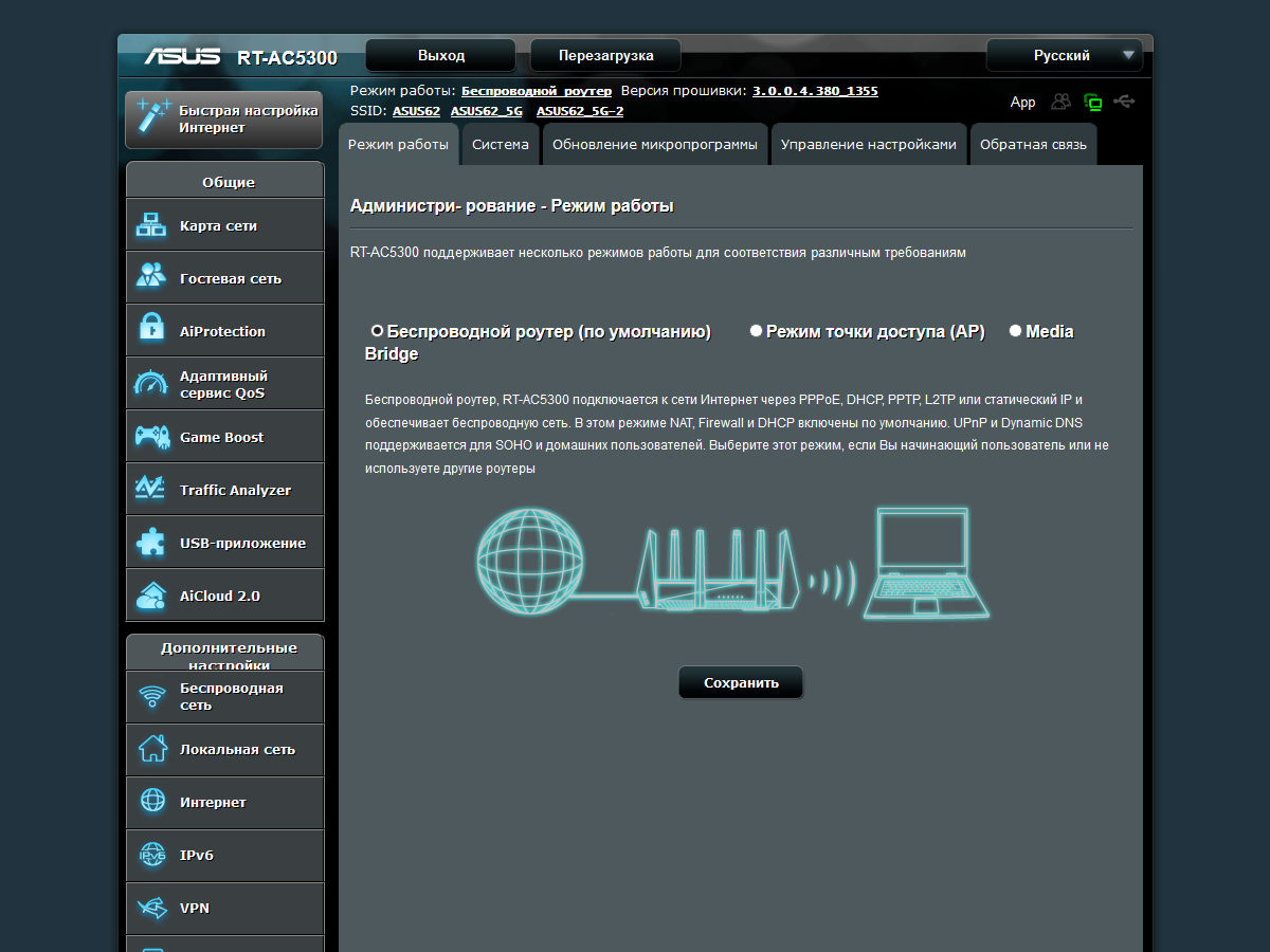 С точки зрения возможностей встроенного программного обеспечения, RT-AC5300 практически не отличается от ранее рассмотренных моделей Asus верхнего сегмента.