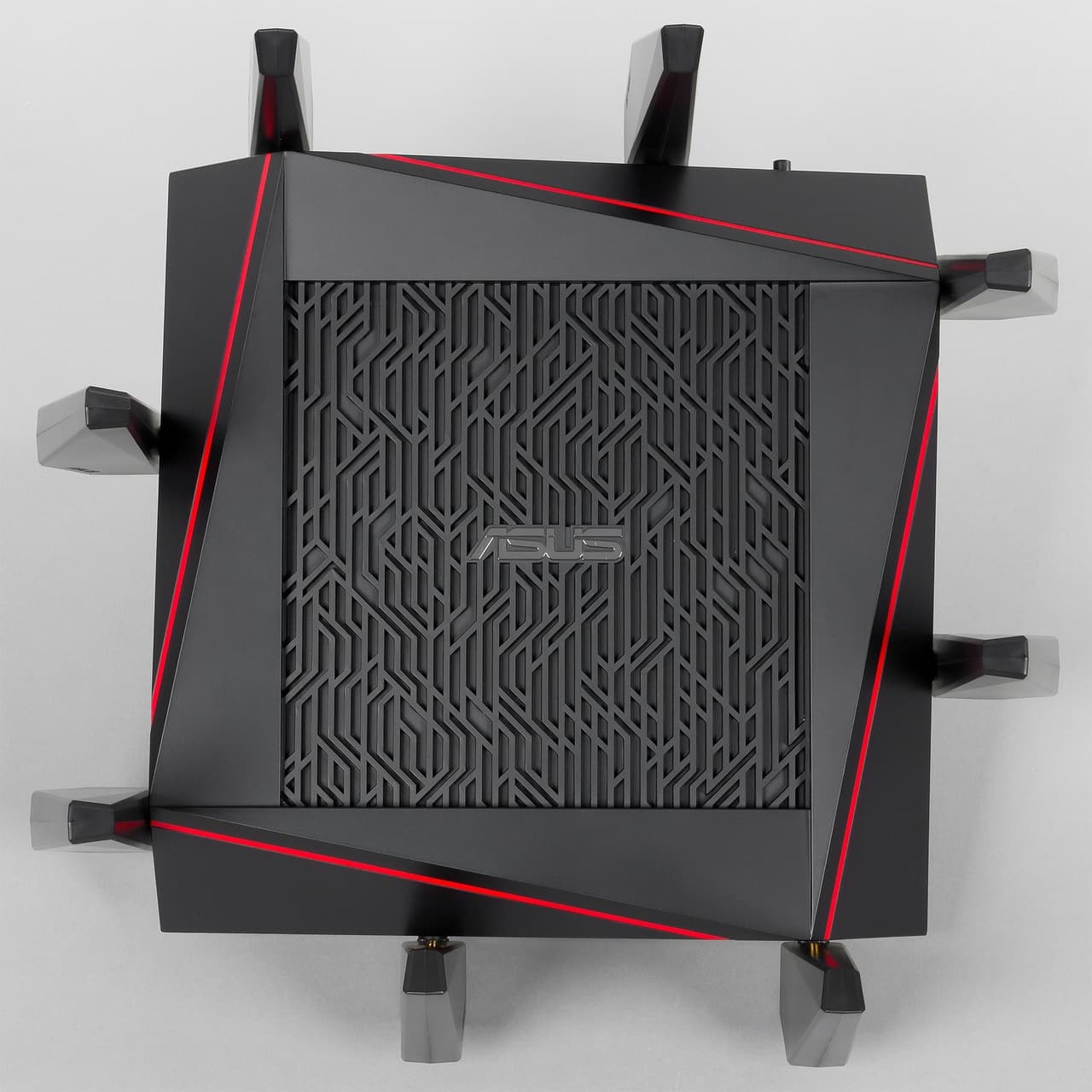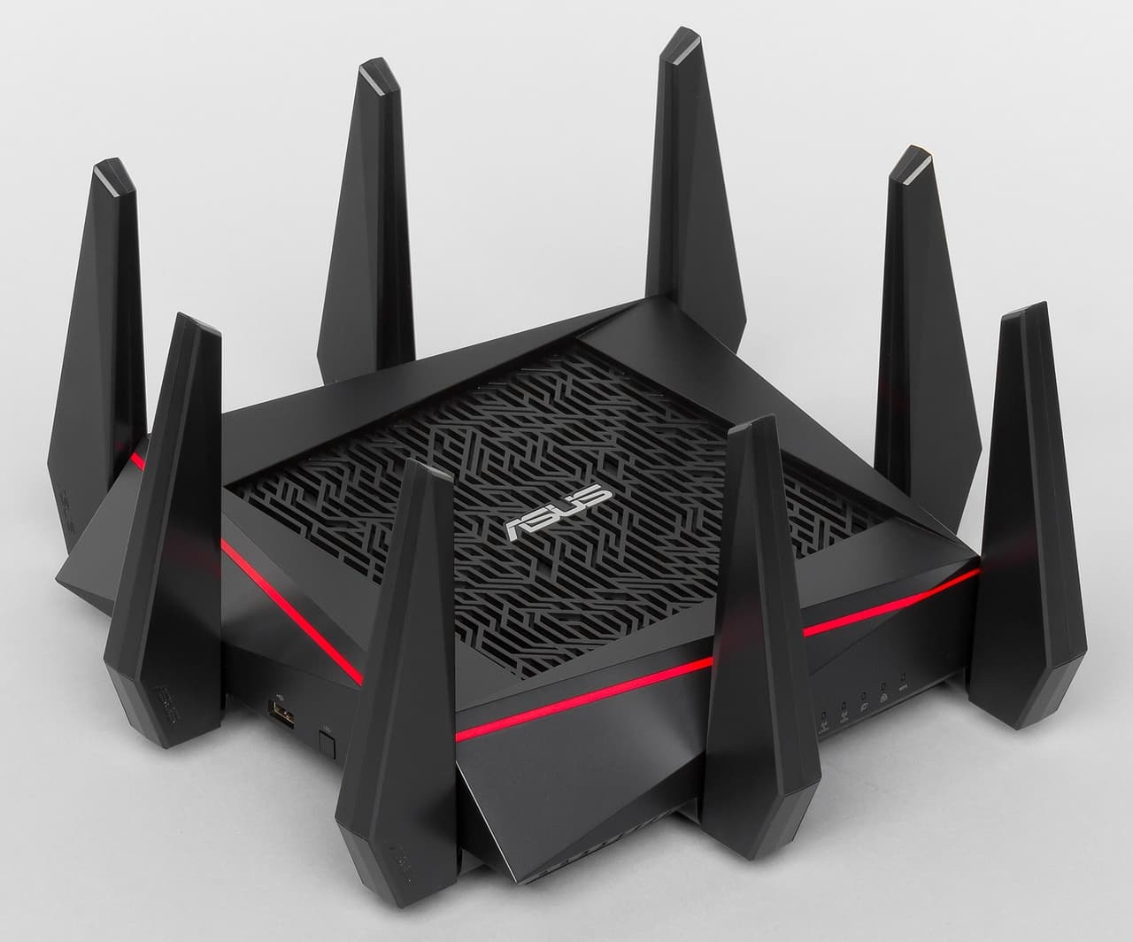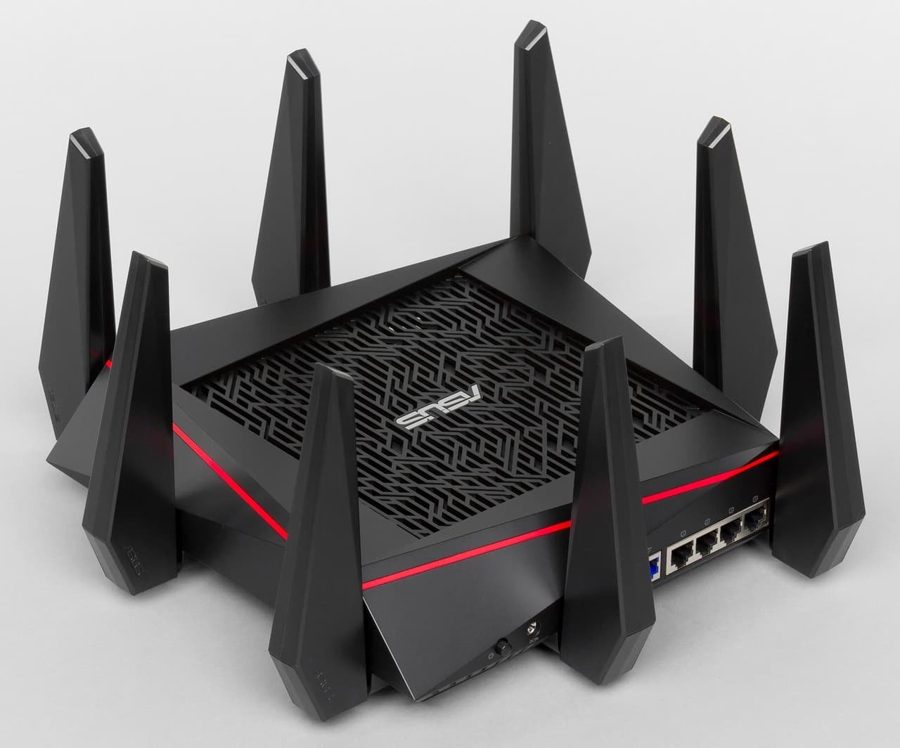Впрочем, расширенные возможности беспроводных подключений — не единственная интересная сторона устройства. В частности стоит отметить использование мощного двухъядерного процессора, работающего на частоте 1,4 ГГц, портов USB 2.0 и USB 3.0, многофункциональной прошивки AsusWRT с множеством дополнительных сервисов. Однако, на наш взгляд, больше всего привлекает внимание дизайн корпуса устройства с восемью антеннами.