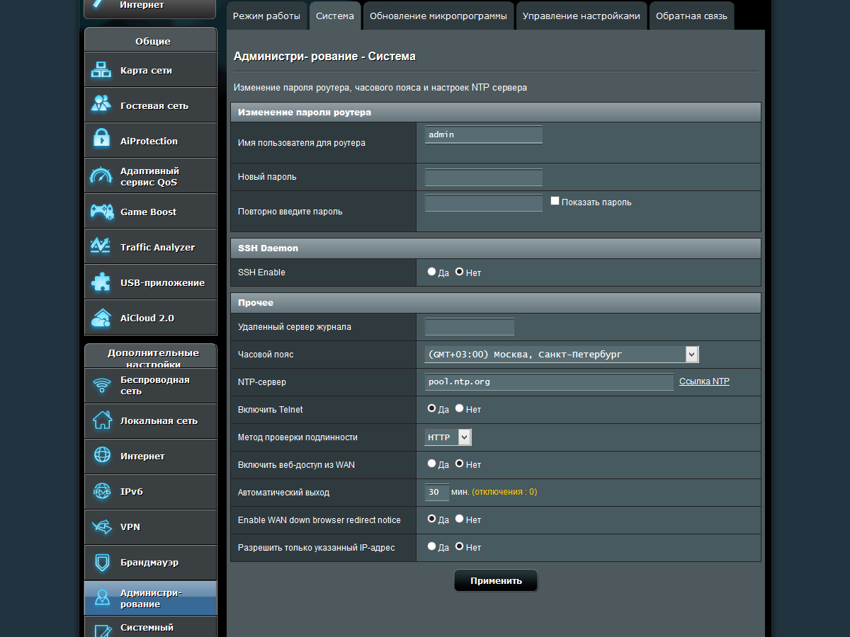 Здесь же мы видим привычные системные настройки, а также пункты обновления прошивки и работы с конфигурацией роутера. Отметим наличие пунктов разрешения доступа к настройкам со стороны интернета, включения протоколов telnet и ssh.