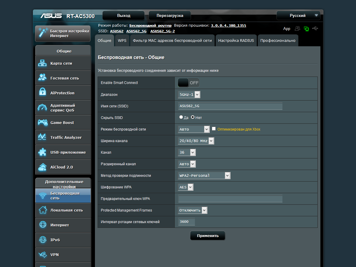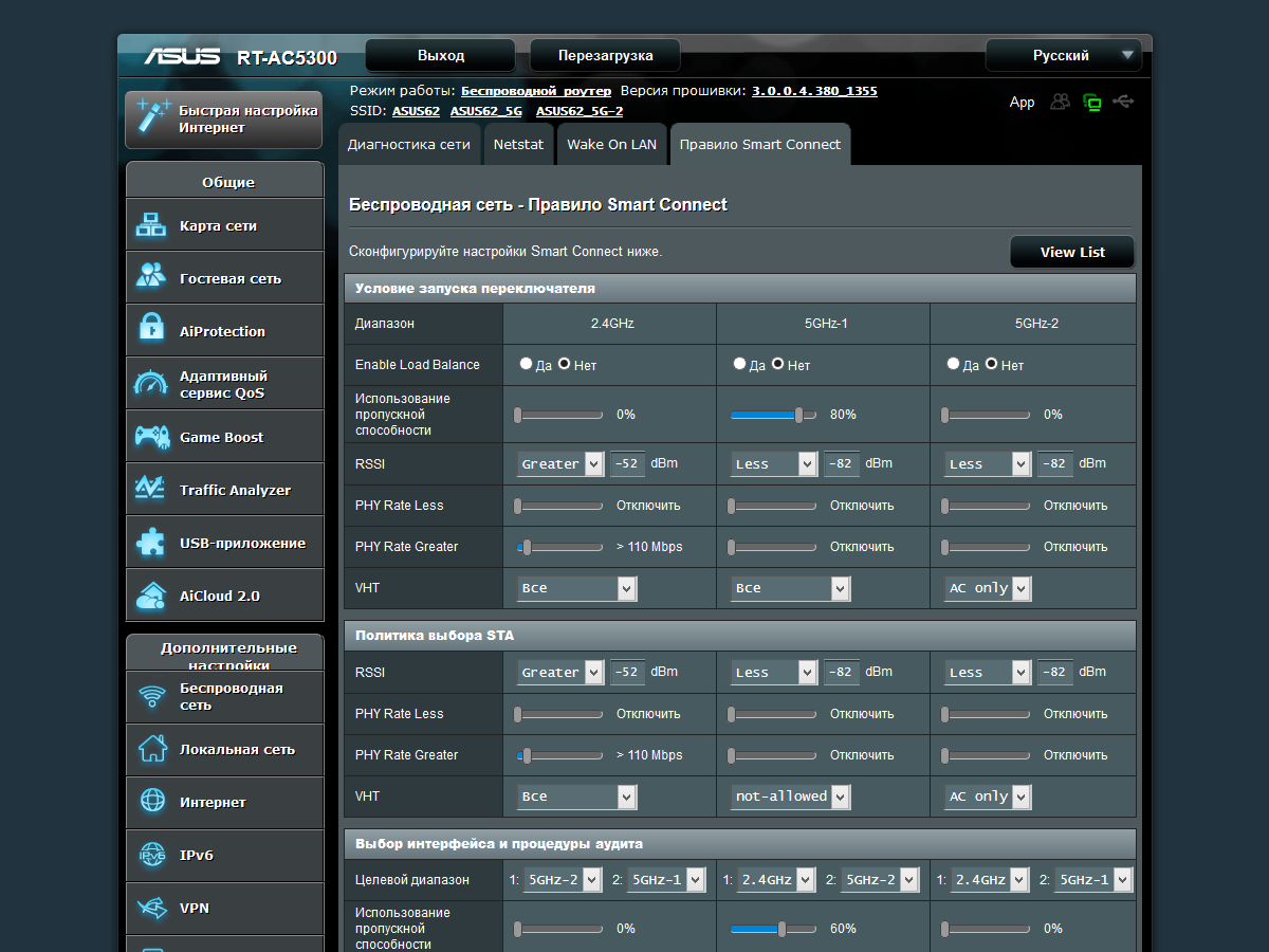 На одной из последних страниц интерфейса спрятаны настройки функции Smart Connect, которая, по замыслу производителя, позволит вам реализовать автоматическое динамическое распределение клиентов по радиоблокам исходя из их возможностей и качества связи. Эффективность ее работы зависит в том числе и от особенностей адаптеров на клиентах и может быть определена экспериментальным путем. На наш взгляд, большинству пользователей будет достаточно установить разные имена сетей и самостоятельно настроить клиентов для работы с ними.