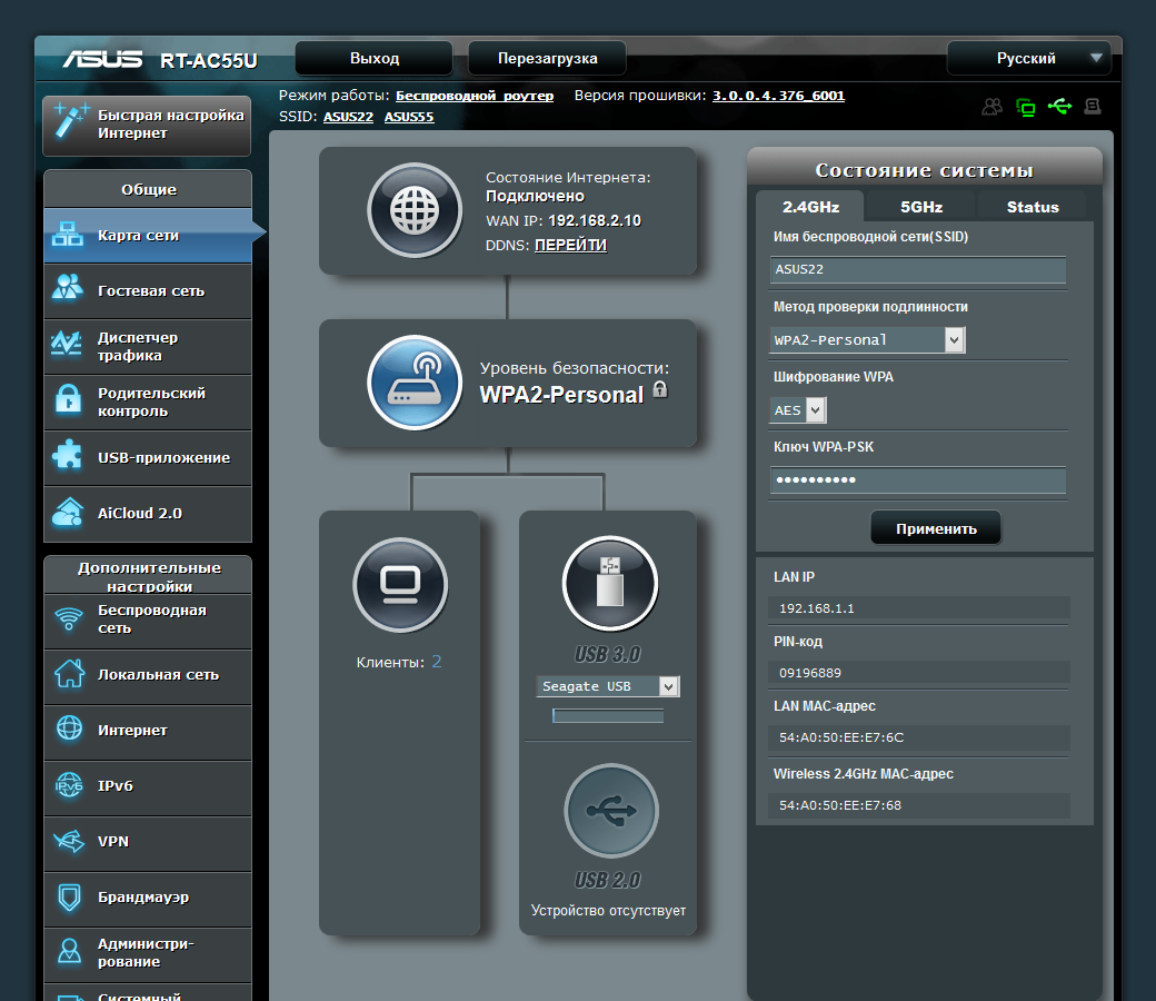 Веб-интерфейс выполнен в темных тонах, имеет выделенные ссылки для перехода к настройкам беспроводных сетей и обновлению прошивки, есть специальные кнопки для перезагрузки, отключения USB-устройств и других востребованных операций.