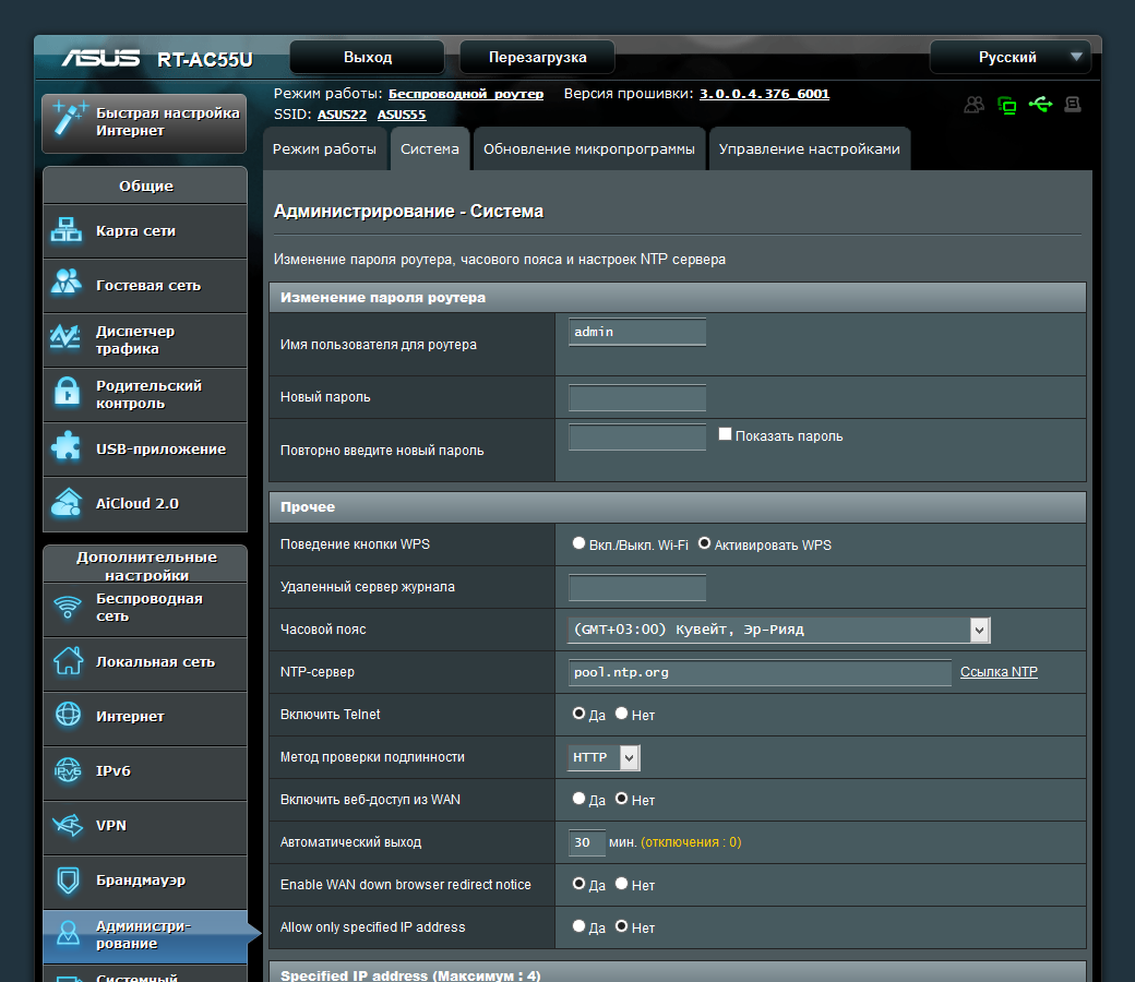 В разделе «Администрирование» представлены привычные функции по изменению пароля администратора, настройке времени, обновлению прошивки, управлению конфигурацией. Есть здесь и удобная возможность переназначить действие кнопки WPS на отключение беспроводных сетей. Сохранилась знакомая по другим устройствам Asus опция доступа к консоли роутера по протоколу telnet. Также в этом разделе находится переключатель режима работы устройства: роутер, точка доступа, беспроводной клиент.