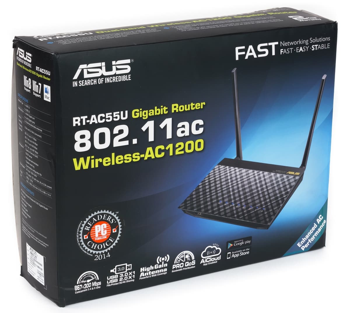 В этом материале мы познакомимся с новинкой в этом сегменте — моделью RT-AC55U. Это устройство основано на платформе Qualcomm Atheros, оборудовано гигабитными сетевыми портами, беспроводными контроллерами с максимальным скоростями подключения 300 и 867 Мбит/с для диапазонов 2,4 и 5 ГГц соответственно, а также имеет два порта USB.