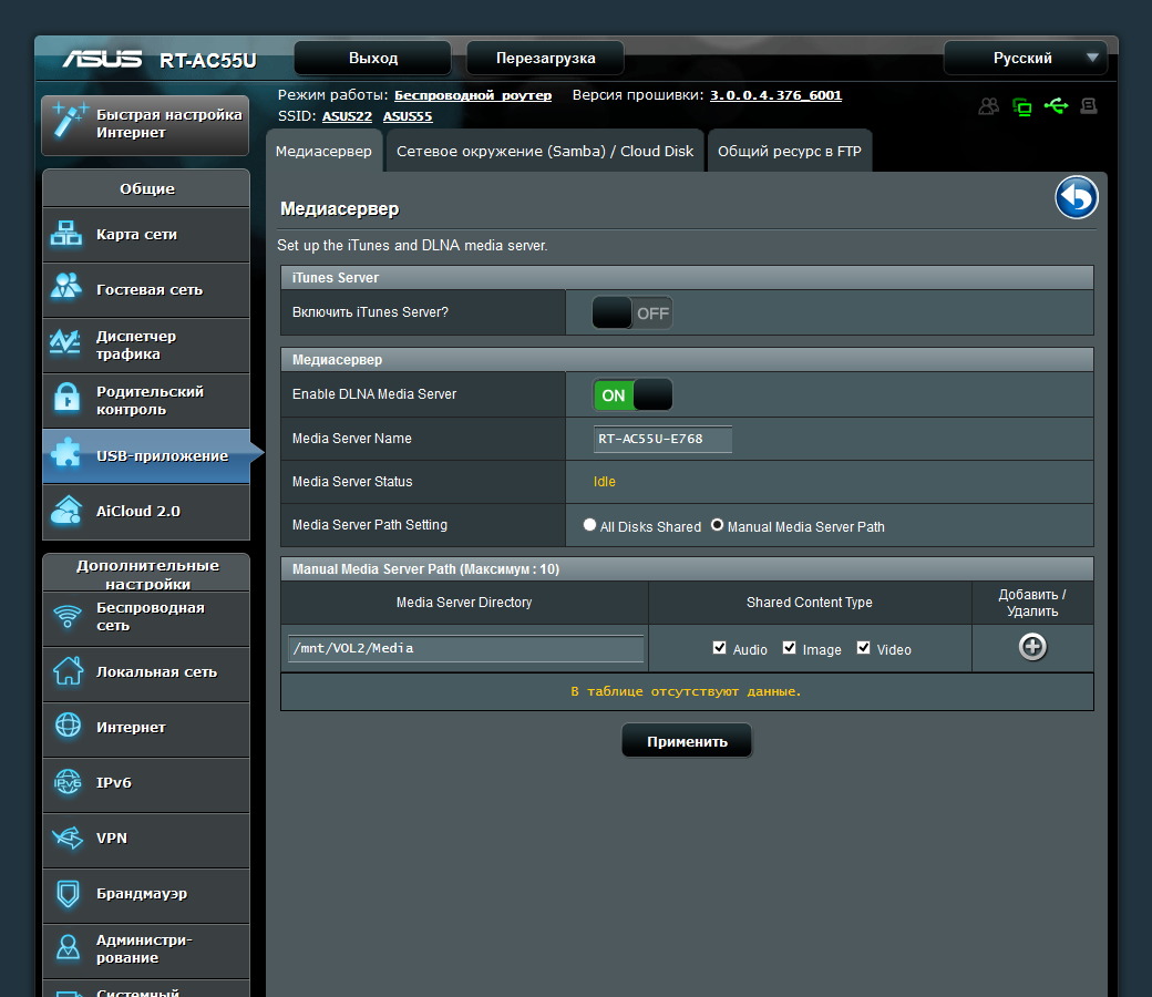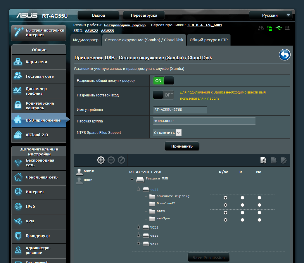 На накопителях поддерживаются файловые системы FAT32, NTFS, EXT2/3/4 и HFS+. Для NTFS в данном роутере используется драйвер Tuxera. Доступ к данным осуществляется по протоколам SMB и FTP. Можно запрограммировать аккаунты пользователей и выдавать им индивидуальные права доступа к папкам на томах. Сервер FTP не имеет никаких настроек, кроме выбора кодовой страницы. При этом работать с ним можно и через интернет. Для настройки удаленного доступа к файлам на дисках предусмотрен помощник AiDisk.