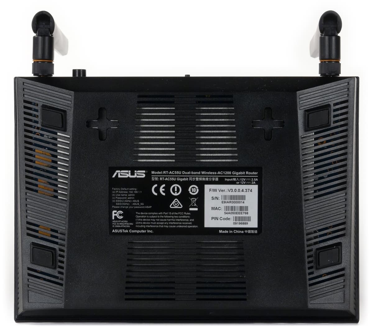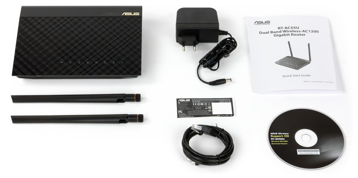 Компания экспериментирует с дизайном корпусов только в топовых моделях, так что RT-AC55U «достался» давно знакомый по предшественникам корпус. Его габаритные размеры без учета антенн составляют 206×148×39 мм. Антенны имеют длину около 20 см, однако «рабочая» часть внутри пластиковых корпусов на самом деле размером в четыре раза меньше.