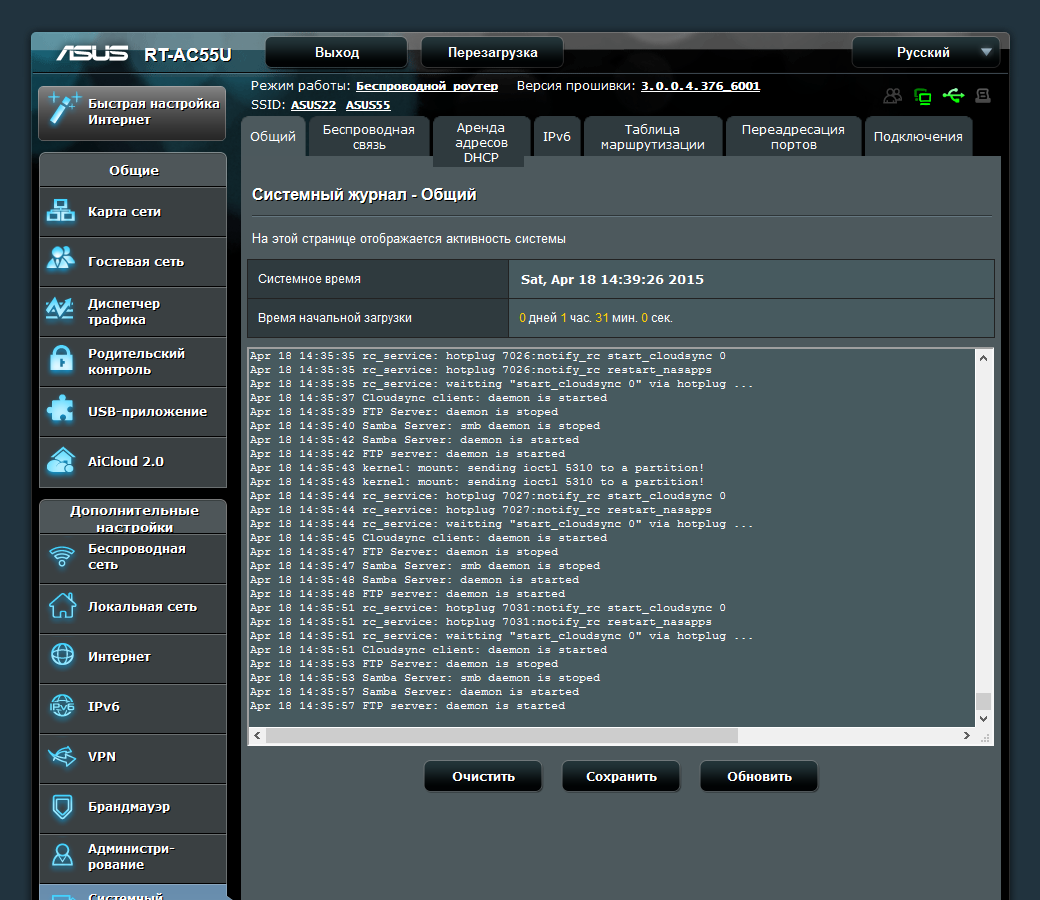 В роутерах Asus кроме стандартного журнала событий есть отдельные страницы с беспроводными клиентами, списком выданных по DHCP адресов, таблицей маршрутизации, настроенными через UPnP правилами трансляции портов и подключениями. Отметим, что кроме хранения в роутере, журнал можно отправлять на сервер Syslog.