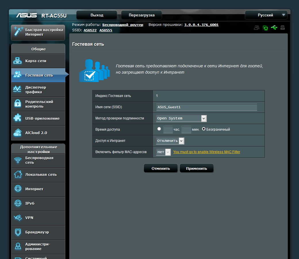 Кроме двух основных беспроводных сетей, можно организовать еще по три гостевых в каждом диапазоне. Для них можно выбрать свой вариант защиты (или оставить сеть открытой), разрешить доступ к устройствам локальной сети, использовать фильтр MAC-адресов, ограничить время работы сети после включения.