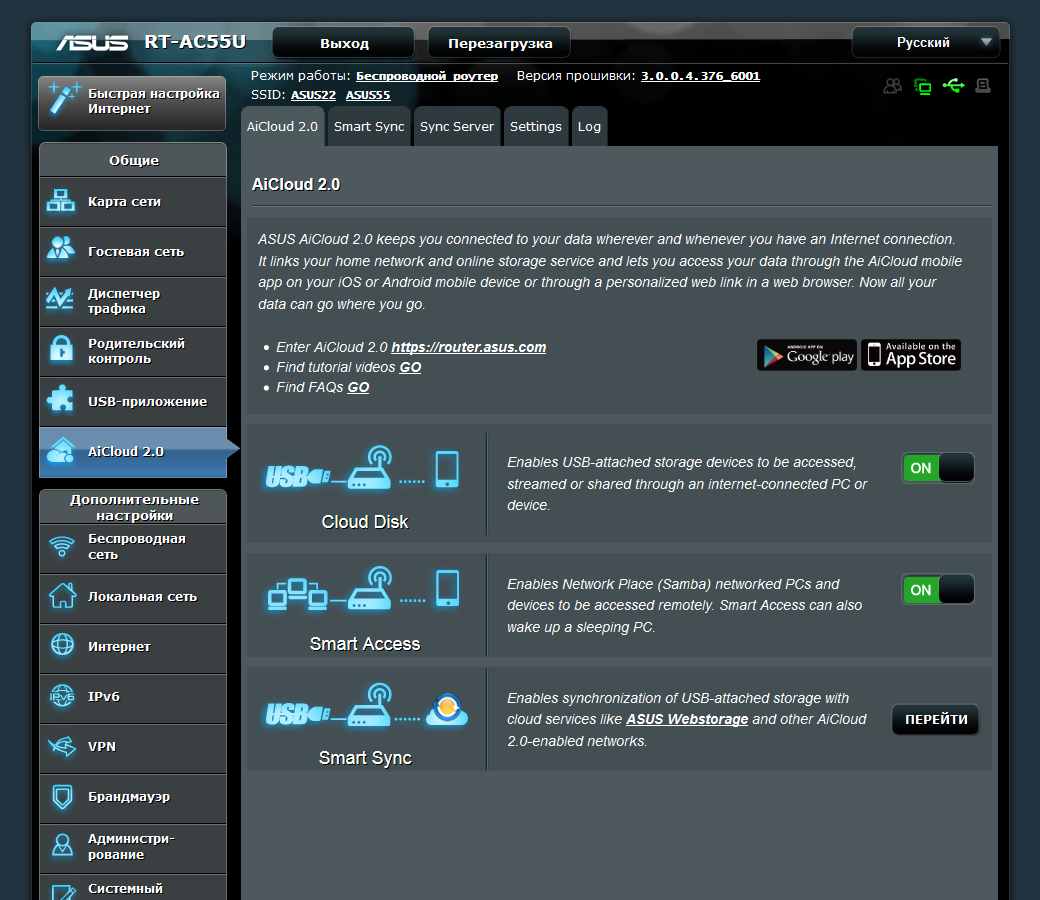 В прошивке реализован AiCloud 2.0 — набор сервисов для удаленного доступа из браузера и фирменных утилит для мобильных устройств, а также синхронизации.