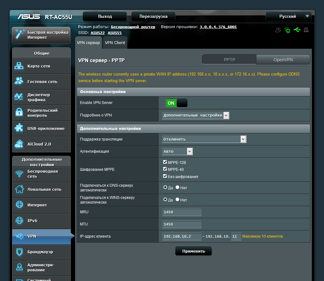 У многих современных моделей этого производителя в прошивке можно найти набор из сервера и клиента VPN, помогающий организовать безопасный удаленный доступ и объединение сетей. В рассматриваемом устройстве для сервера есть поддержка протоколов PPTP и OpenVPN, а клиент умеет работать с PPTP, L2TP и OpenVPN.