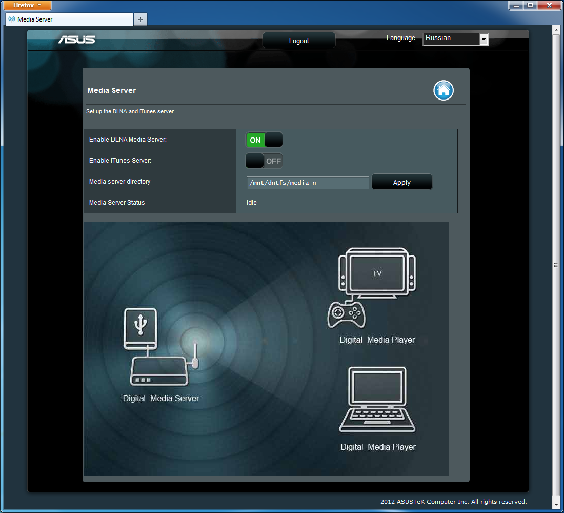 Как и у рассмотренных ранее устройств Asus, в данной модели внешние накопители можно использовать для реализации сервисов автономной загрузки файлов и раздачи медиаконтента в локальной сети по DLNA.