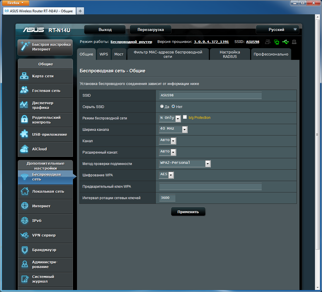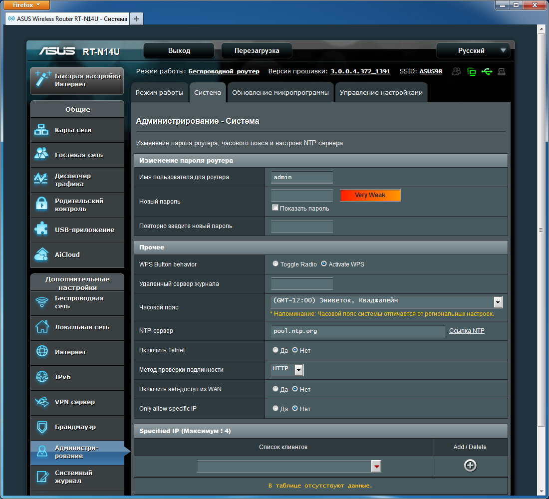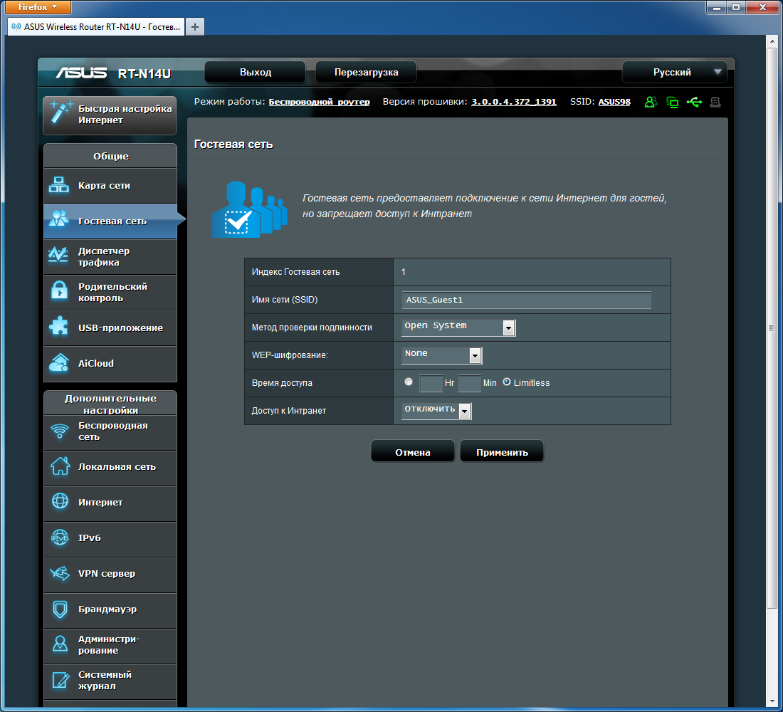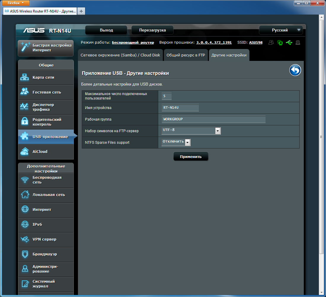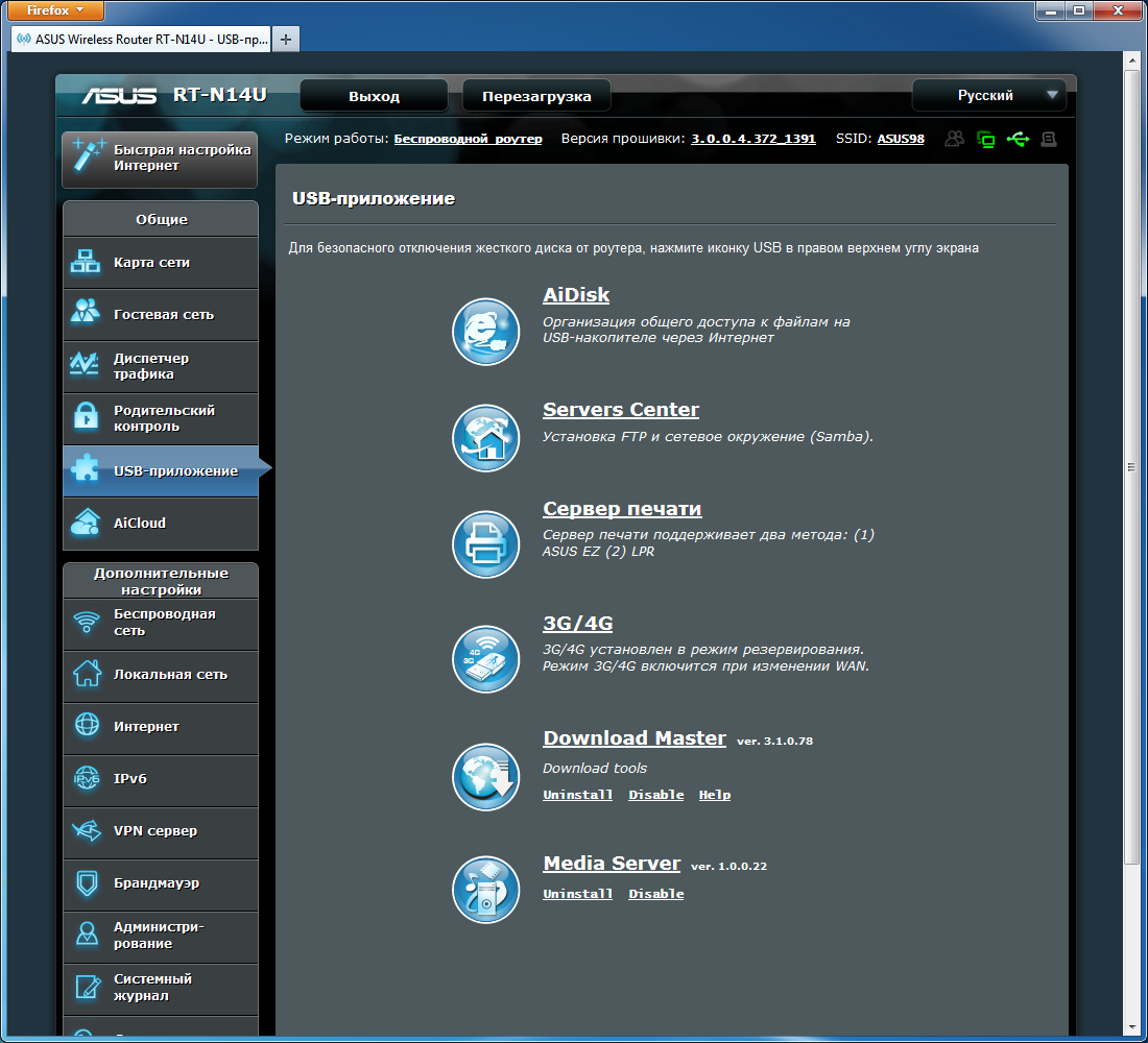 Тестирование роутера проводилось с прошивкой версии 3.0.0.4.372_1391. Штатная возможность поиска обновлений из веб-интерфейса давно не работает, так что придется самостоятельно загрузить образ с сайта компании и установить в роутер.