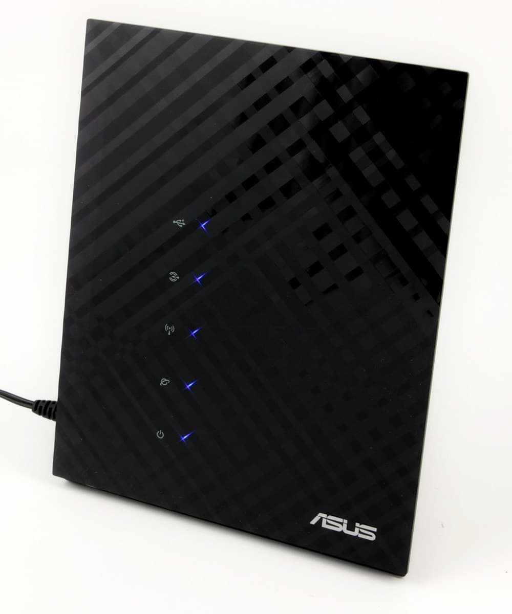 Роутер с самого первого знакомства производит впечатление недорогой модели — его вес в коробке практически не чувствуется. Корпус устройства традиционно изготовлен из черной пластмассы. В целом по дизайну он очень похож на RT-N56U, который был представлен примерно полтора года назад. Новая модель также имеет переднюю глянцевую панель с «бриллиантовым» оформлением. Остальные элементы матовые. В этот раз производитель предусмотрел несколько вариантов установки: вертикально на столе с использованием комплектной подставки и на стене с любой ориентацией разъемов. Отметим, что подставка тоже из пластика и не имеет никаких утяжелителей внутри.