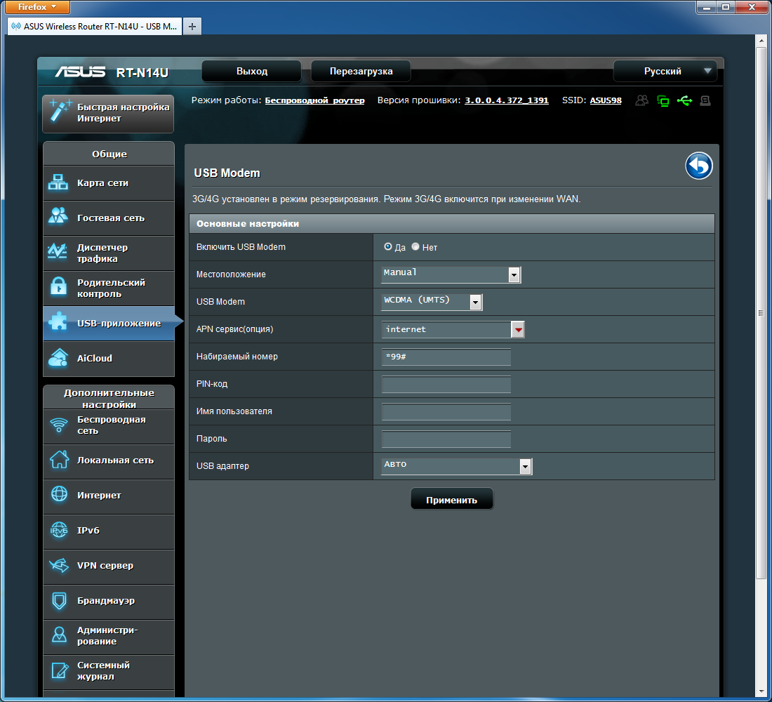 Доступ к интернету через сети 3G/4G поддерживается только в стандартном режиме «USB-модем», более современный вариант NDIS в текущей версии прошивки не реализован. Так что возможно вам потребуются дополнительные действия для изменения настроек модема или подбор совместимого устройства. Тестирование с Huawei E392 в сети столичного оператора Мегафон показало, что скорость работы такого соединения достаточно высока: более 20 Мбит/с на прием и передачу. Еще раз напомним, что на нее существенно влияют условия приема и загруженность базовой станции.