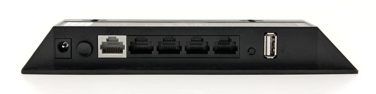 Скрытая кнопка сброса находится в нижнем левом углу задней панели и до нее будет сложно добраться в случае крепления роутера на стену. Остальные разъемы доступны в любом варианте установки, поскольку находятся на левом боку. Сверху вниз: порт USB, кнопка WPS, четыре порта LAN, порт WAN, выключатель питания, разъем питания.
