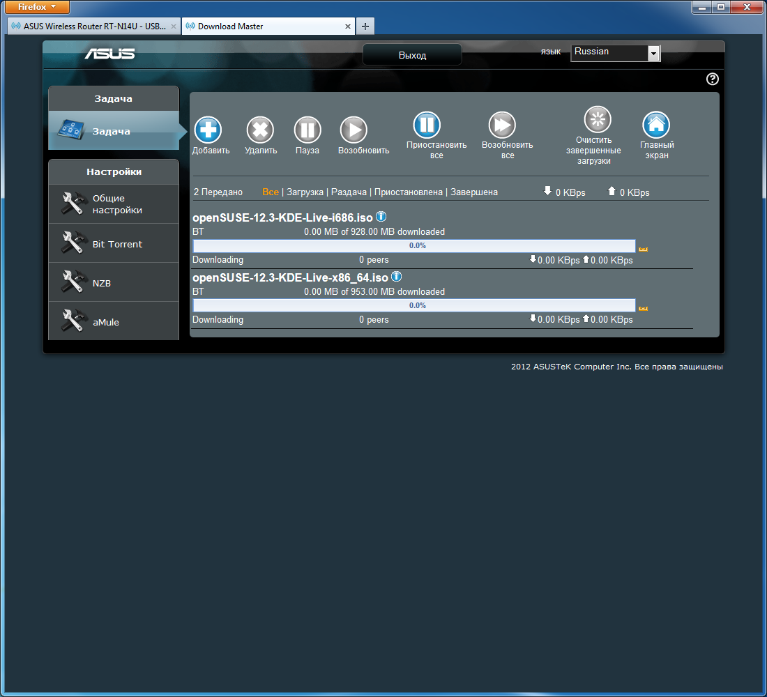Для загрузки файлов без участия ПК используются модули amuled, nzbget, snarf и transmission. Поддерживается работа с прямыми ссылками http, ftp, magnet и протоколами BitTorrent, NZB и emule. При необходимости, можно управлять сервисом и из интернета. В настройках указывается рабочая папка, номер порта интерфейса управления, порты и ограничения скоростей для BitTorrent и другие опции. Фактическая скорость работы p2p-клиента невысока — у нас получилось увидеть результат немногим более 1 МБ/с на популярных задачах. Клиент показался не очень удобным в использовании. Кроме того, при одновременной работе с сервером DLNA наблюдаются существенные задержки в отображении интерфейса и реакции на действия пользователя.