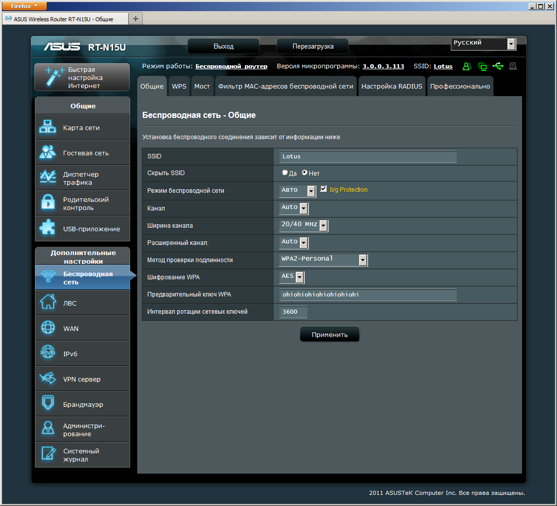 Внешний вид web-интерфейса мало отличается от рассмотренных ранее моделей ASUS. Он имеет перевод на несколько языков, включая русский. Местами встречаются упоминания о двух диапазонах и 450 Мбит/с — наследие старшей модели. Предусмотрена встроенная справочная система, что будет полезно новичкам. Также отметим наличие помощника для базовой настройки устройства. При необходимости можно разрешить доступ к настройкам с порта WAN.