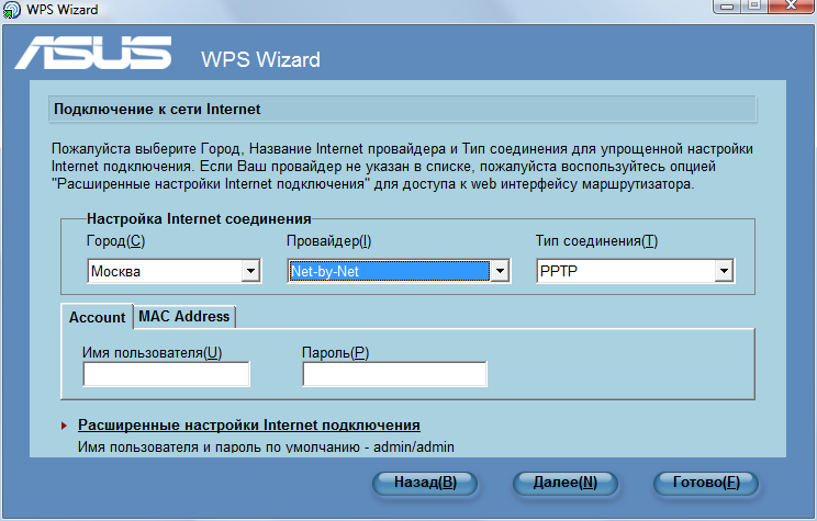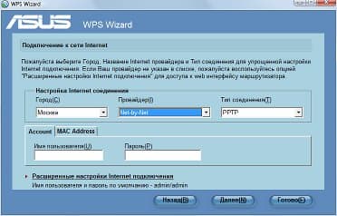 А вот третья утилита уже может больше, чем можно было бы предположить по ее названию. По-сути WPS Wizard не только настраивает беспроводные подключения, но также способен помочь в установке параметров доступа к сети Интернет. В его базе есть большое число отечественных провайдеров и для подключения к ним достаточно указать минимальный набор данных. Например для Corbina — только имя и пароль, для Net-by-Net — имя пользователя, пароль и MAC-адрес.