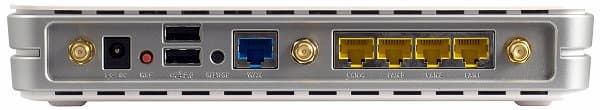 Все разъемы сосредоточены сзади: вход блока питания, один порт WAN и четыре LAN, три коннектора для антенн, два порта USB. Также есть кнопки сброса и настройки WPS. Расположение последней несколько спорно. Все-таки для удобного подключения новых беспроводных устройств к сети было бы лучше иметь ее на лицевой стороне или хотя бы сбоку. Но не между антенн, проводов и USB-кабелей.