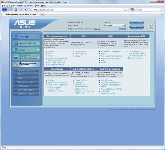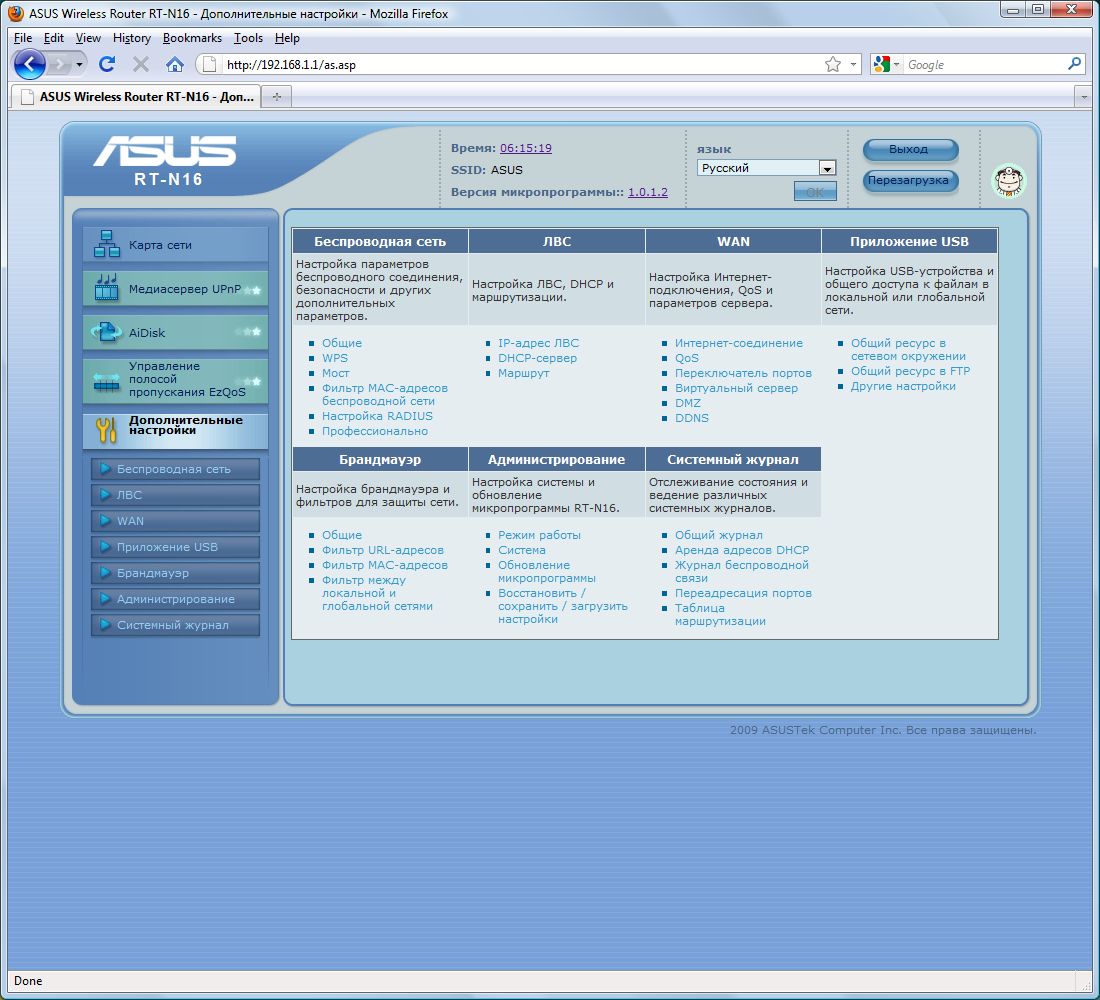 На первый взгляд интерфейс устройства заметно отличается от большинства аналогичных моделей. Дело в том, что первая страница, которую видит пользователь, представляет собой графическую карту сети, а все подробные настройки спрятаны в меню. В рассматриваемой модели есть полный русский перевод интерфейса, кроме того предоставляется интерактивная справка по пунктам меню, тоже на русском языке.