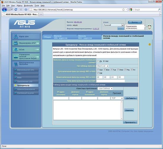 Как и большинство современных топовых устройств, рассматриваемая модель снабжена встроенным межсетевым экраном. Правила настраиваются между сегментами LAN и WAN. Каждое из них может включать адрес или подсеть получателя и отправителя, номера портов, тип протокола. Заданный пользователем список работает как «белый» или как «черный». Кроме этого, можно указать дни недели и время дня, когда функция активна.