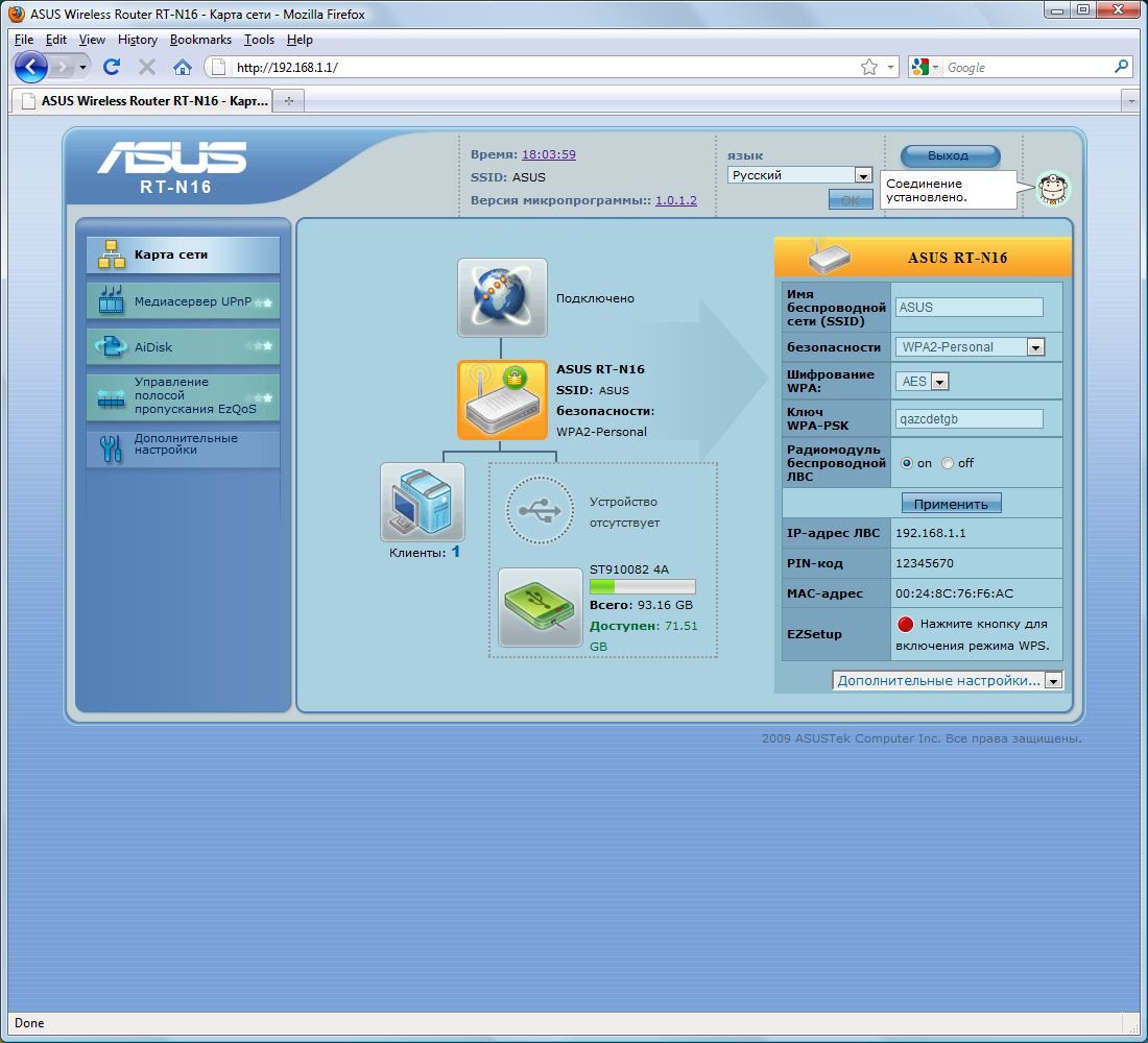 На карте отображается текущее подключение к сети Интернет, локальные клиенты и USB-устройства. На каждой из представленных иконок можно щелкнуть мышкой и тогда в правой части основного окна появятся пункты выбора некоторых соответствующих выбранному элементу параметров, которые производитель счел наиболее важными. Например, имя беспроводной сети и ключ шифрования или безопасное отключение накопителя.