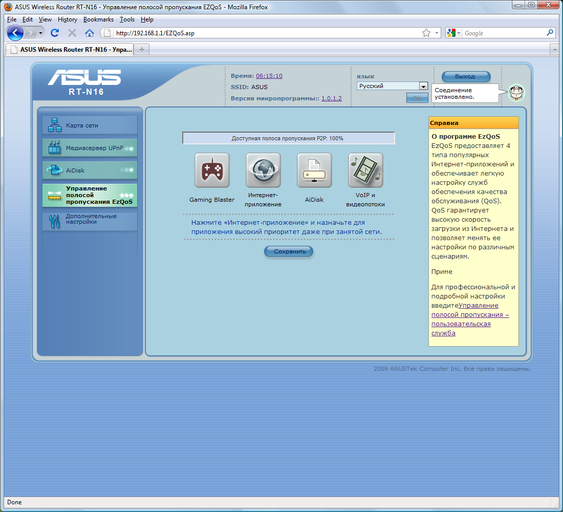 Пункт «Управление полосой пропускания EzQoS» обеспечивает быстрый доступ к разным профилям системы управления полосой пропускания — игры, интернет, FTP-сервер, потоковое видео и звук. Идея в принципе неплохая, однако совершенно не понятно как и что там оптимизируется в указанных случаях, что также затрудняет тестирование. Как и для других функций, есть отдельные страницы более полными настройками, к которым мы и переходим.