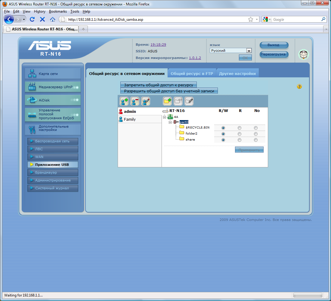 Для доступа к накопителям есть сразу несколько вариантов — привычное сетевое окружение, сервер FTP и медиасервер UPnP AV. Для первого из них необходимо создать на накопителе хотя бы одну папку в корневой директории, или же это сделает сам роутер. После этого надо создать пользователей с указанием имени и пароля (предустановленны admin и Family) и указать им права для доступа к каждой папке. Если вы доверяете всем устройствам и пользователям локального сегмента сети, то парольный доступ можно отменить и тогда всем будут предоставлены полные права. Из других настроек упомянем выбор имени и рабочей группы роутера, а также отключение данного сервиса. Скорость работы составляет примерно 8 МБ/с на чтение и 4 МБ/с на запись (измерено с жестким диском в формате NTFS). От устройства с гигабитными сетевыми портами можно было бы ожидать и большей производительности, но стоит напомнить, что это все-таки роутер, а не NAS. Так что учитывая параметры процессора и стоимость RT-N16 эти цифры заслуживают, на наш взгляд, хорошей оценки. Форматирование винчестера в файловую систему EXT2 не оказывает существенного влияния на скорость сетевого доступа.