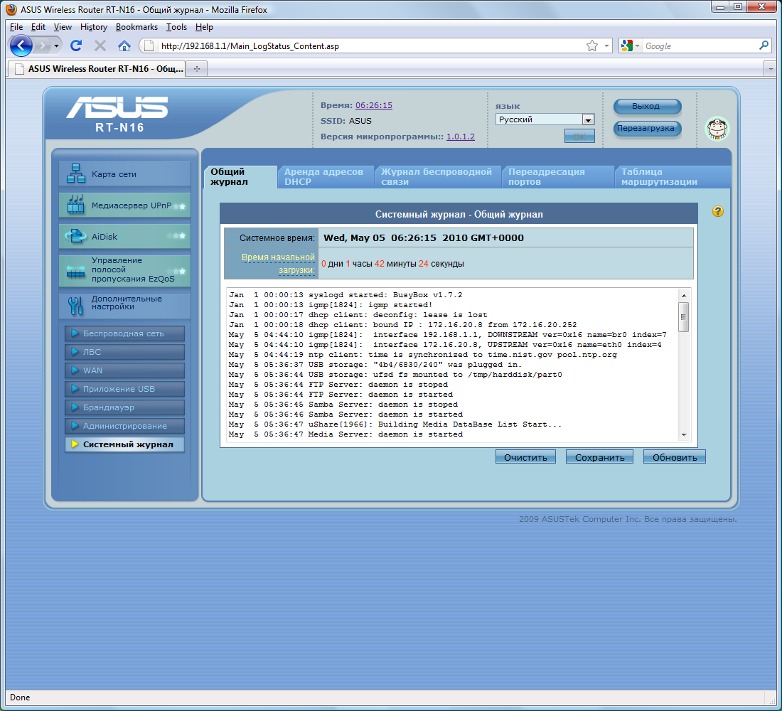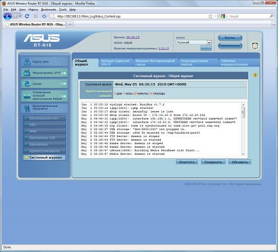Последняя группа состоит из нескольких страниц с системными журналами. Кроме обычного общего списка событий, есть страницы статуса сервера DHCP, беспроводных клиентов, переадресации портов (полезно в случае наличия UPnP-клиентов, которые их самостоятельно пробрасывают) и таблица маршрутизации. Отметим, что смотреть все это можно только локально — никаких средств по внешнему хранению событий не предусмотрено.