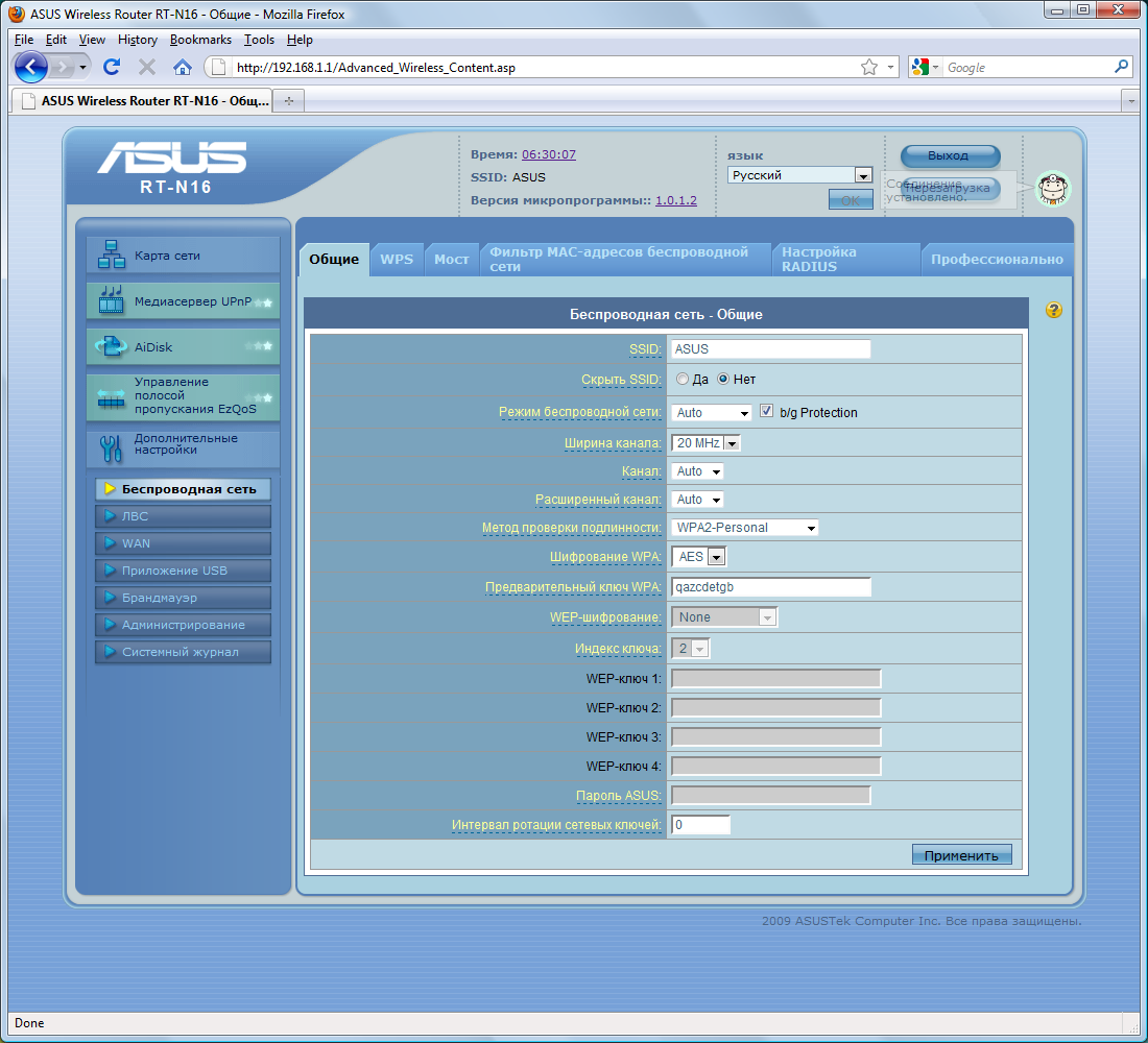 Первая из них посвящена настройке беспроводного соединения. Кроме обычных настроек, таких как имя сети, номер канала и параметров безопасности (включая WPA и WPA2), можно выбрать режим работы (авто, b/g, n, g, b), установить «двойной» канал для 802.11n, выбрать время работы беспроводной сети, включить «ускорение» передачи и изменить некоторые другие параметры.