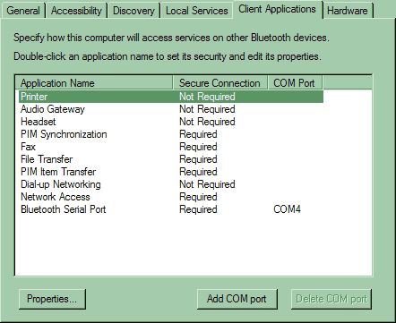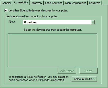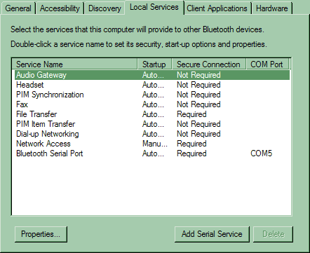 Следующие две закладки очень важны. Первая из них позволяет настроить сервисы, предоставляемые данным компьютером другим Bluetooth-устройствам. Главное это то, будет ли данный сервис запускаться автоматически или же по выбору пользователя (меня долго доставал стандартный значок ХР, рапортующий о том, что сетевой кабель к одному из сетевых интерфейсов не подключен, пока я не вспомнил о возможности просто выключить данный сервис :)), а также нужно ли устанавливать защищенную соединение для доступа к данному сервису. Также здесь можно насоздавать виртуальных последовательных портов (нужно для совместимости со старым ПО) или поудалять их когда необходимость пропадет.