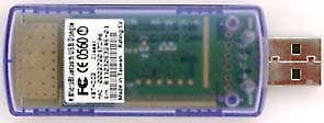 Несмотря на высокую дальность работы, устройство достаточно компактно и не имеет никаких внешних антенн (хотя некоторые производители крепят их и к адаптерам Class 2). Размерами и внешним видом оно сильно напоминает обычный флэшдрайв, только немного более угловатый. Корпус сделан из полупрозрачной пластмассы, через которую отлично видна начинка устройства. Прозрачность корпуса позволяет индикатору активности стильного голубого цвета весьма интересным образом подсвечивать комнаут при выключенном внешнем освещении :) Вот защитного колпачка, закрывающего разъем (как у флэшдрайвов) нет, но, в общем-то, и не нужен.