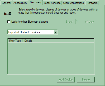 Следующая закладка позволяет компьютеру искать другие Bluetooth-устройства в зоне видимости автоматически через определенные промежутки времени, а также выбирает, какие устройства будут отображаться в папке «My Bluetooth Places» все возможные или только принадлежащие к определенным классам.
