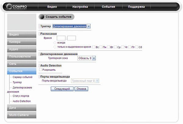 Следующий пункт меню «События» → «Триггер»: нажимаем «Создать», выбираем тип триггера (например, «Детектирование движения») и дополнительные параметры (например, область с номером 0, 1 или 2 — для детектирования движения, или время — для срабатывания по расписанию):
