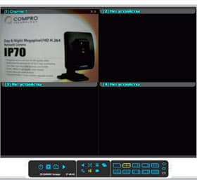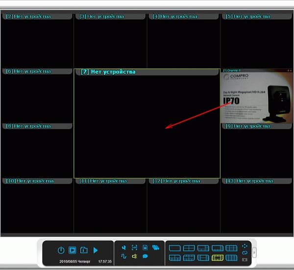 При наличии нескольких (до 32) камер мы можем вывести на экран в виде «мозаики» картинки с каждой из них, выбрав удобный для нас вариант расположения; два из многих возможных показаны на скриншотах ниже. На тестировании была только одна камера, подключенная к 1-му каналу (она-то и показывает картинку); остальные каналы лишь отображают черное поле с надписью «Нет устройства»: