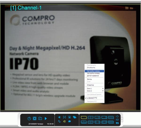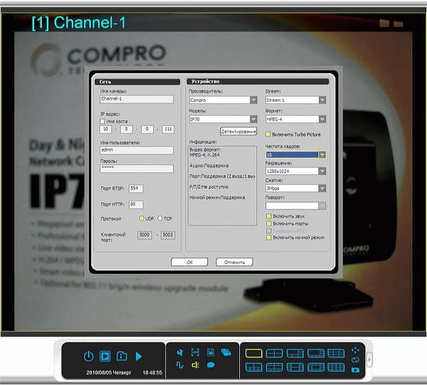 Настроить параметры качества и сжатия можно, если вновь щелкнуть правой кнопкой мыши на любом месте изображения с камеры и выбрать пункт «Настройки камеры» (верхний из двух; одинаковое название в ComproView они имеют только в русском интерфейсе, а в английском называются «Camera Setup» (верхний) и «Channel Setup» (нижний)).