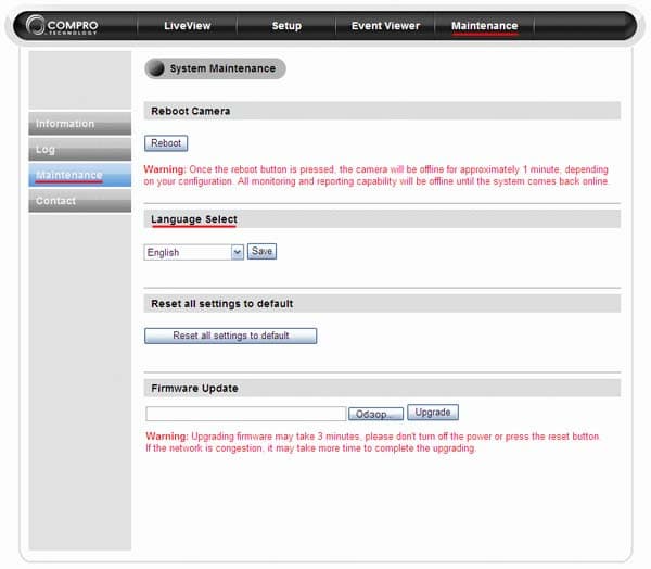 Также можно обновить прошивку firmware (на той же странице, где мы выбирали язык); крайне желательно делать это с подключением всего участвующего в процессе оборудования к ИБП — случайное пропадание питания во время перепрошивки (даже если обычно с напряжением в питающей сети всё благополучно, не будем забывать про «закон бутерброда»!) может превратить нашу камеру в «бездыханное тело», оживить которое будет очень непросто. Как было сказано выше, сам файл прошивки можно скачать на сайте производителя, но можно воспользоваться и тем файлом, который скачивается в составе ComproView версии 1.41. После обновления легко заметить изменение номера версии firmware с 1.48 на 1.499 и обещанное производителем появление в списке поддерживаемых турецкого языка (порадуемся за жителей Турции).