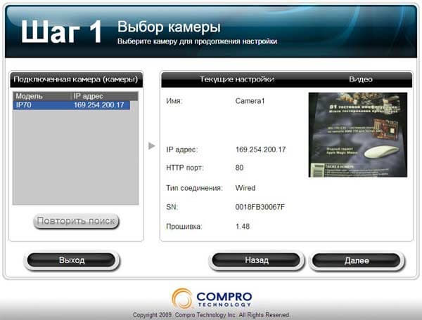 На втором шаге предлагается выбрать камеру для продолжения настройки — выдается список найденных в сети камер (в Windows XP система безопасности выдает сообщение о том, что брандмауэр заблокировал некоторые возможности программы, и предлагается их разблокировать); при выделении мышью нужной камеры выводится как список ее текущих настроек, так и картинка, полученная с камеры. У нас камера была одна, так что долго выбирать не пришлось; можно увидеть IP-адрес камеры, серийный номер и номер прошивки (в нашем случае — 1.48).