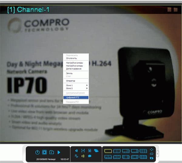 А двойной щелчок мыши «развернет» изображение во всё отведенное для этого поле окна программы; повторный двойной щелчок вернет «мозаику». Можно развернуть изображение с камеры и на весь экран монитора, нажав уже знакомую нам кнопку с символом «включение-выключение» (всплывающая подпись на русском языке гордо гласит «Главная») и выбрав в появившемся меню пункт «Полный экран», либо нажав специальную кнопку с тем же всплывающим названием в нижнем меню программы (возврат с помощью клавиши Escape, о чем выводится предупреждение). Можно задействовать и 4-кратный цифровой зум; для этого щелкаем правой кнопкой мыши на любом месте изображения с камеры и выбираем пункт «Цифровой PTZ»: