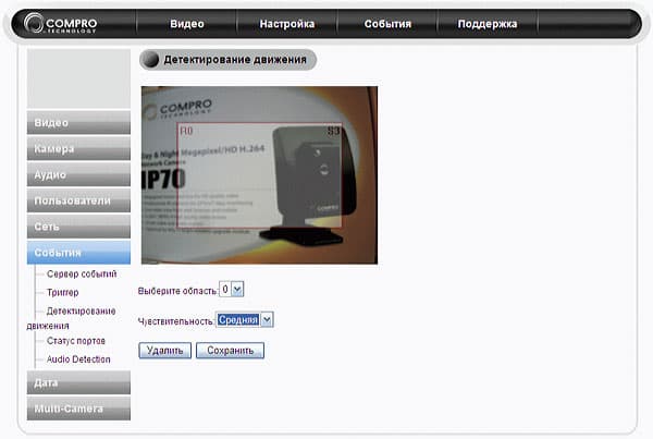 - детектирование событий — движение, исчезновение объекта, появление подозрительного объекта, изменение сцены, появление лица, а также детектирование звука и пропадания сигнала с камеры;