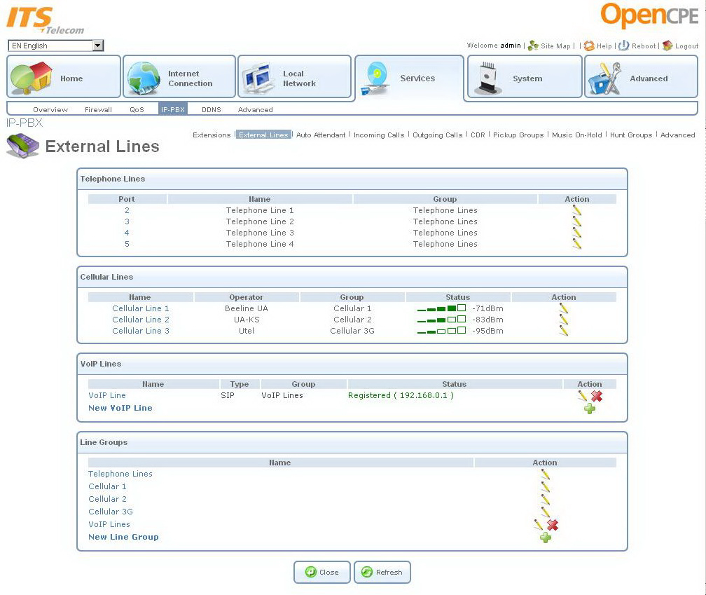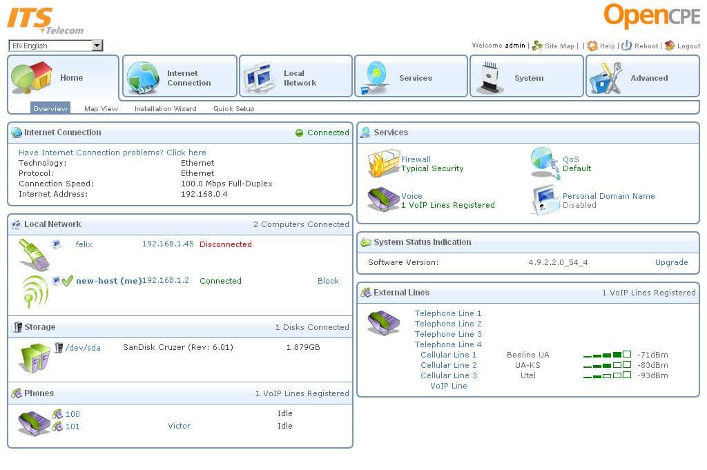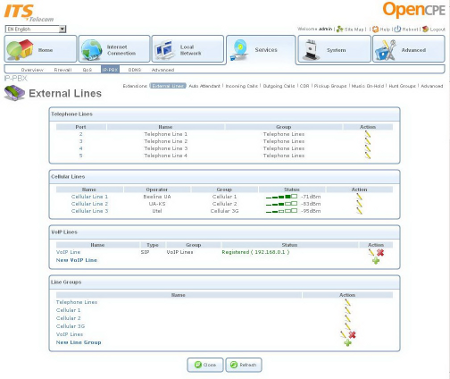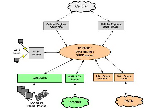 Другими словами, к данному устройству можно подключить аналоговые телефонные линии, линии IP-телефонии (SIP-транки) и, что в общем-то самое уникальное, две SIM-карты любого оператора мобильной связи, работающего в стандартах GSM 900/1800, и одну SIM-карту оператора связи 3G (UMTS 2100) (эта же карточка может работать и в стандарте GSM 900/1800).