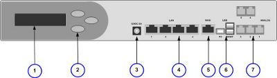 - 7 Разъемы аналоговых телефонных интерфейсов, обозначенных как: 1 фиксированный FXS, 2-5 программируемые FXS/FXO